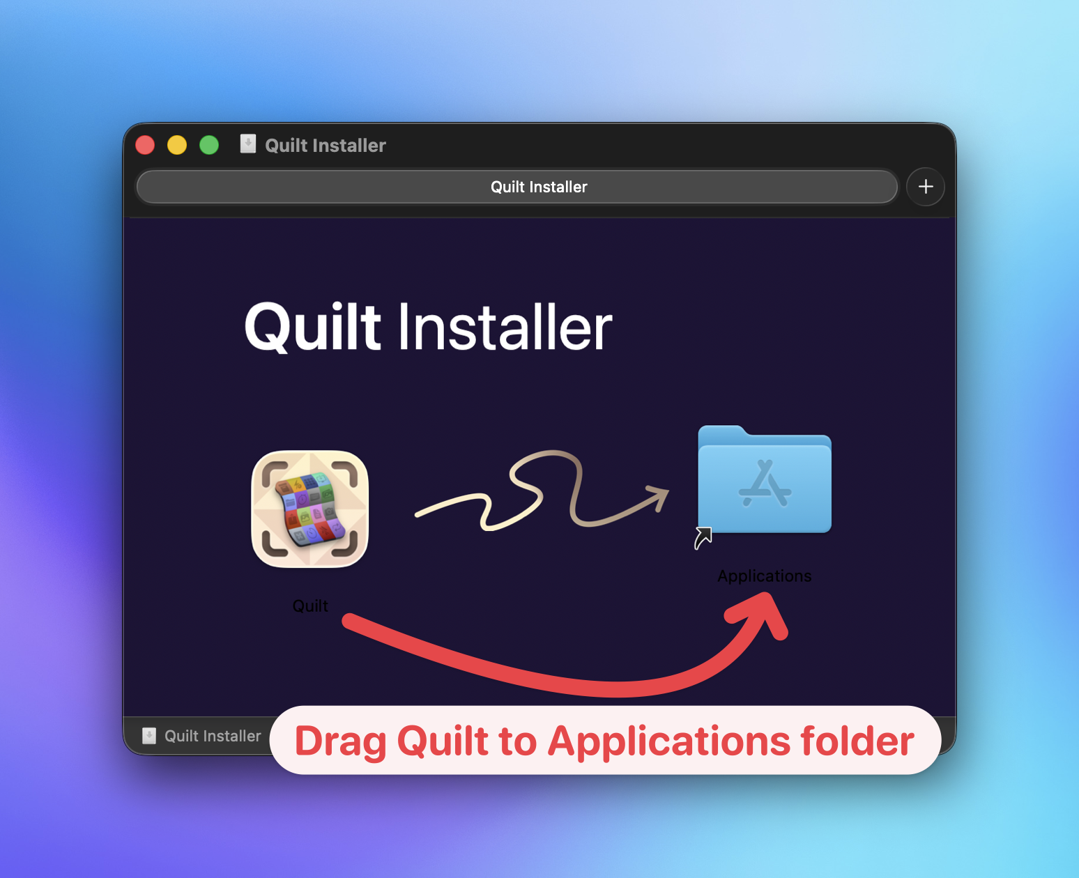 - Open the .dmg file and drag Quilt to your Applications folder