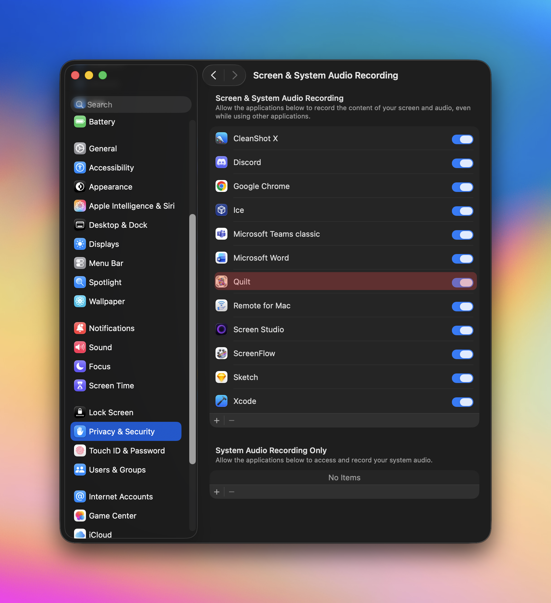 - Navigate to Privacy & Security → Screen Recording